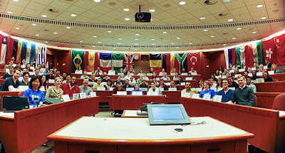 Studentów MBA na roku jest około 930. Podzieleni oni są na 10 grup. Mamy 93 studentów w jednej sali. Każdy z nich ma przydzielone swoje miejsce w sali i nie może jego zmienić, aż do końca pierwszego roku. Studenci również nie zmieniają nigdy sali. To profesorowie przychodzą do nich. Każdy student ma swoje imię i nazwisko przed sobą. Jak widać, na ścianach widnieją flagi. Na początku roku, międzynarodowi studenci mogę powiesić flagę swojego kraju. Widać jak bardzo różnorodna jest tutaj klasa.
